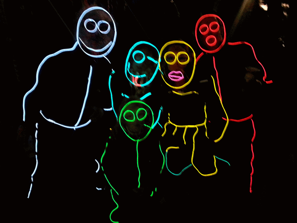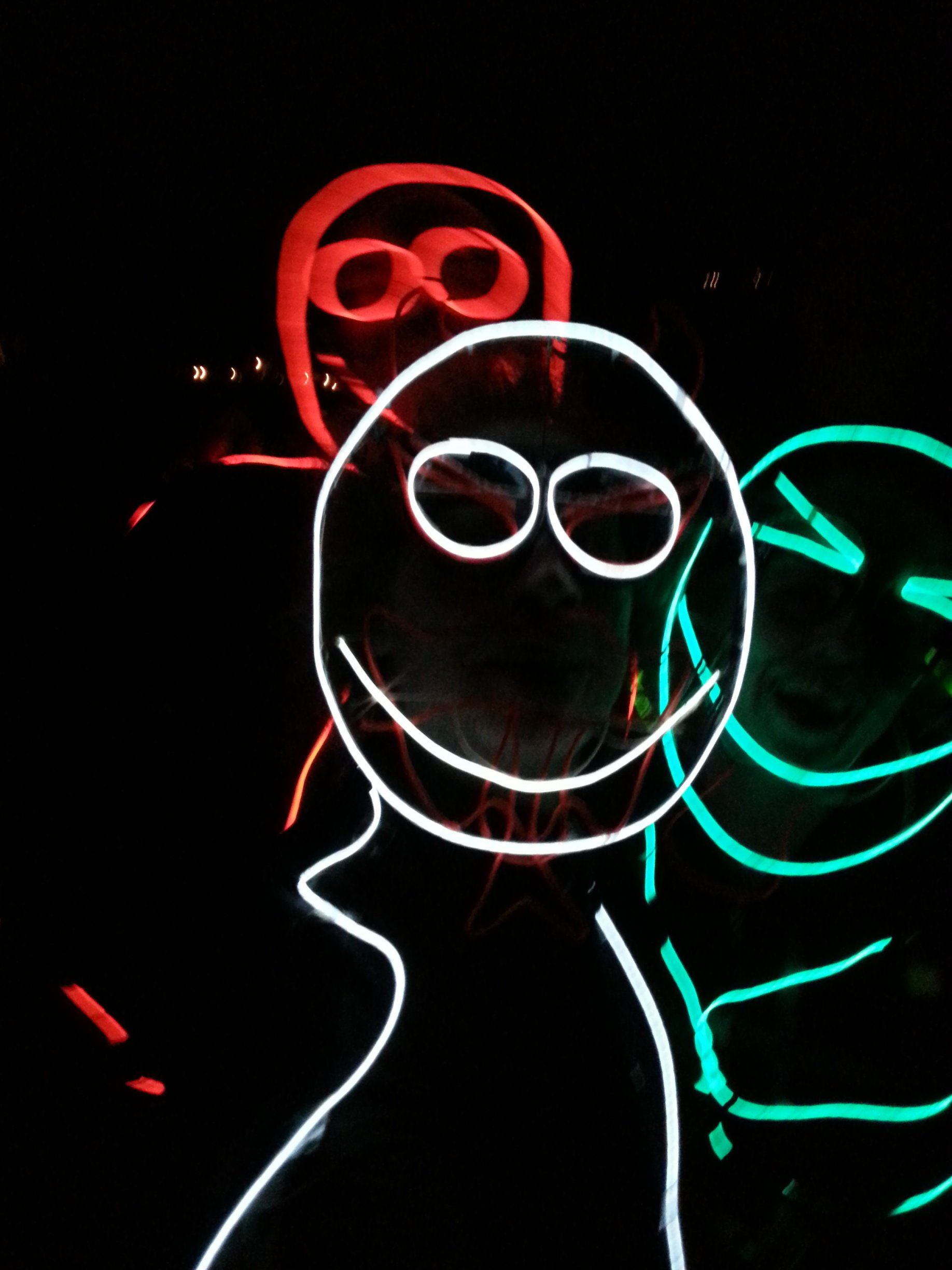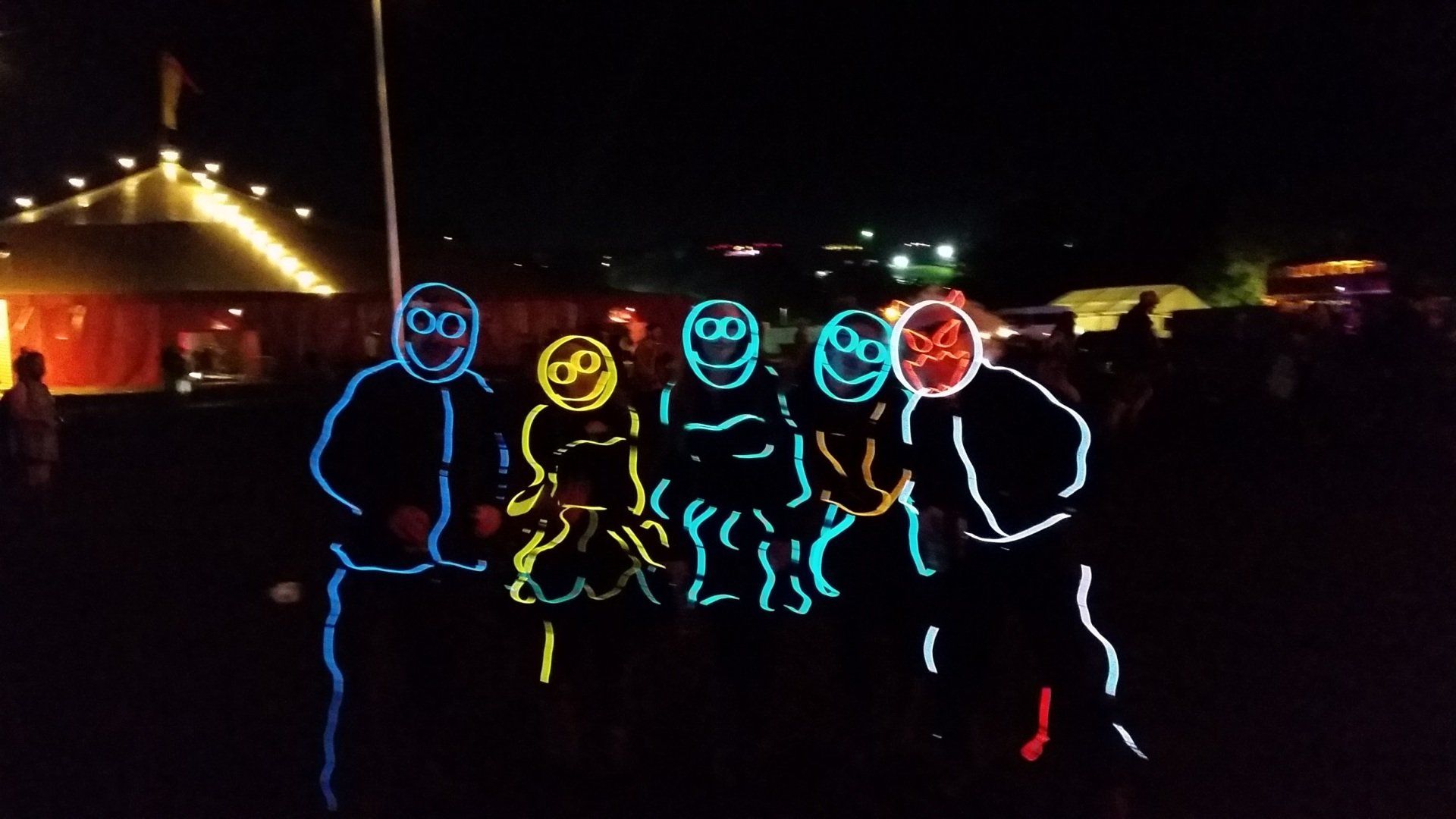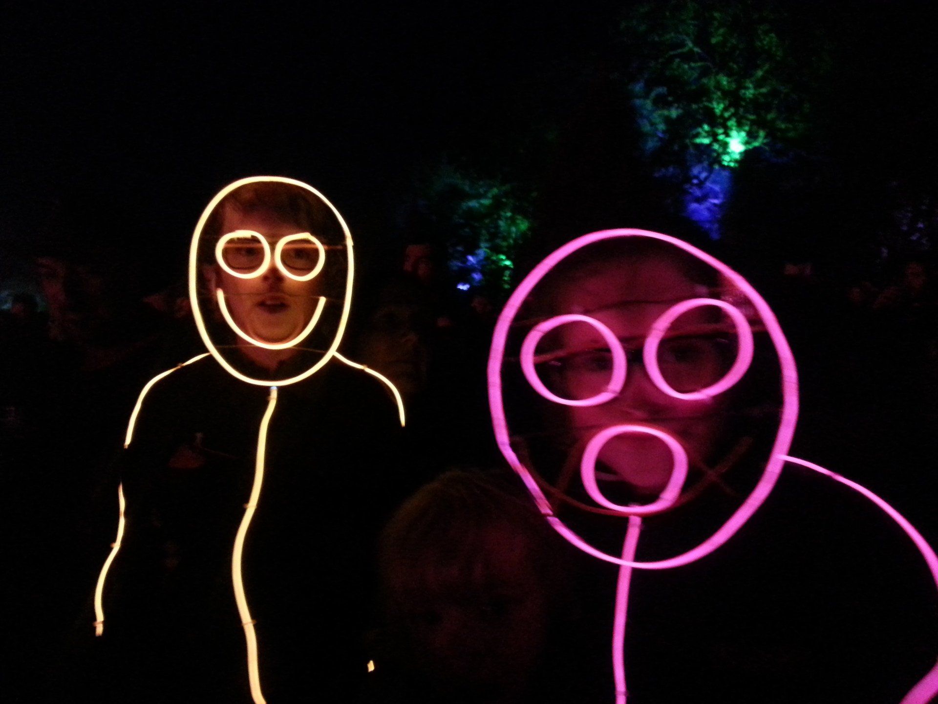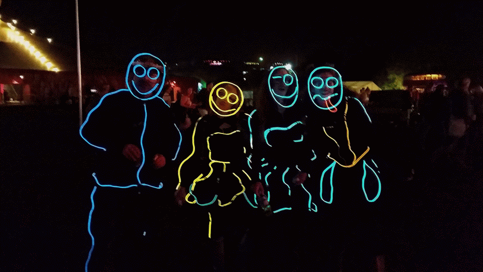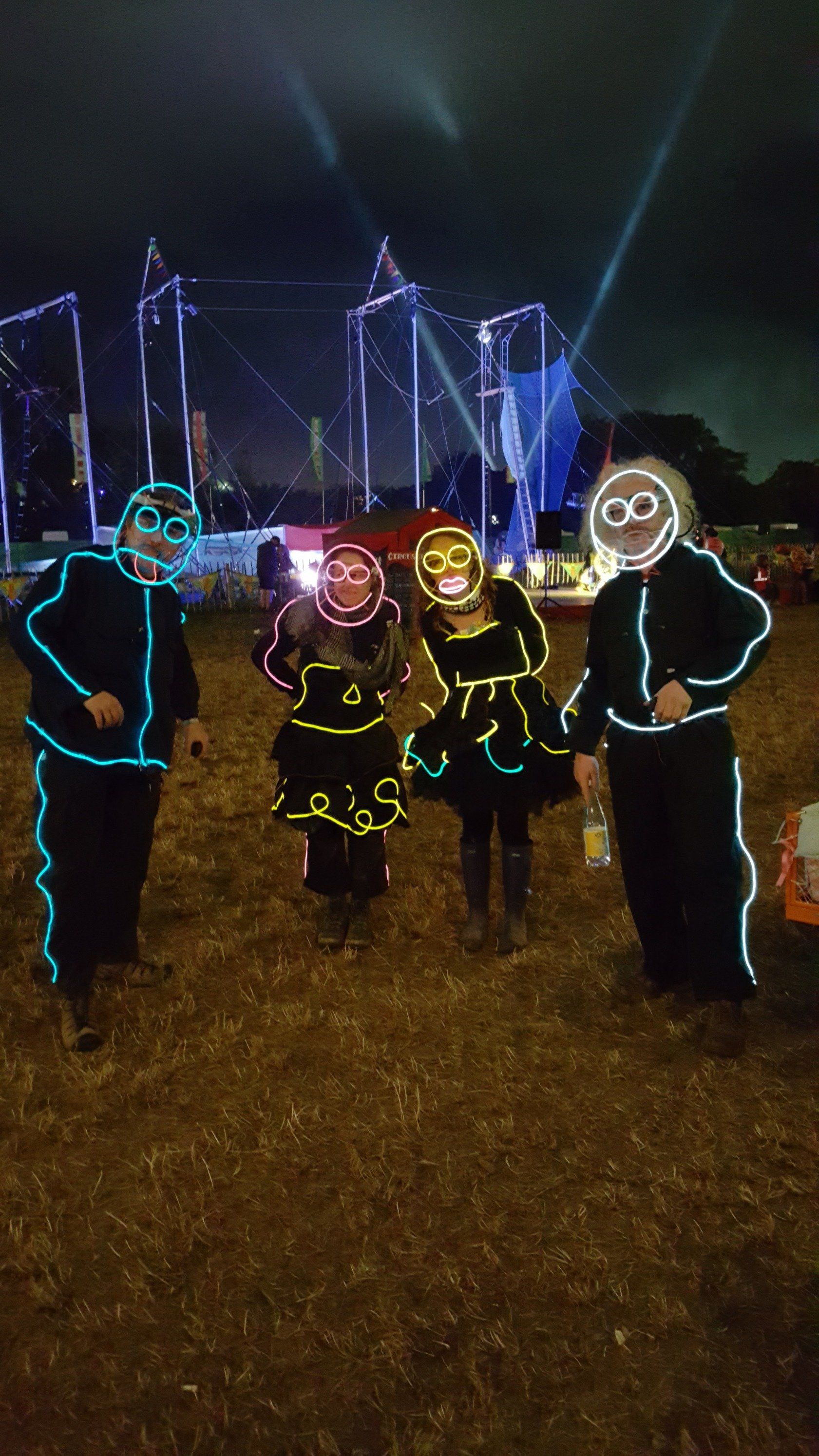 We have had various guest appearances from friends over the years in a variety of colours. In the last five or so years we have had a hardcore crew of three reappearing glow people: Sam (blue), Nella (yellow) and last, but definitely not least, Jane (green).